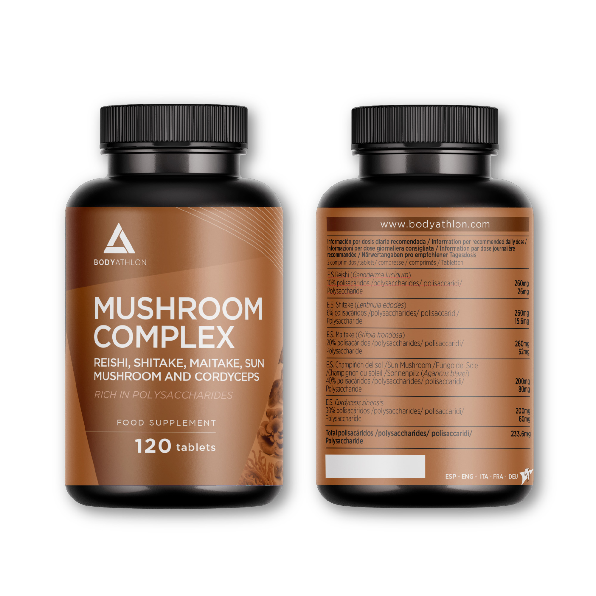 El complejo de hongos de Bodyathlon es rico en polisacáridos y beta-glucanos, este mushroom complex fortalece el sistema inmunológico y mejora la respuesta del organismo ante agentes externos gracias a su contenido en shitake y champiñón del sol.